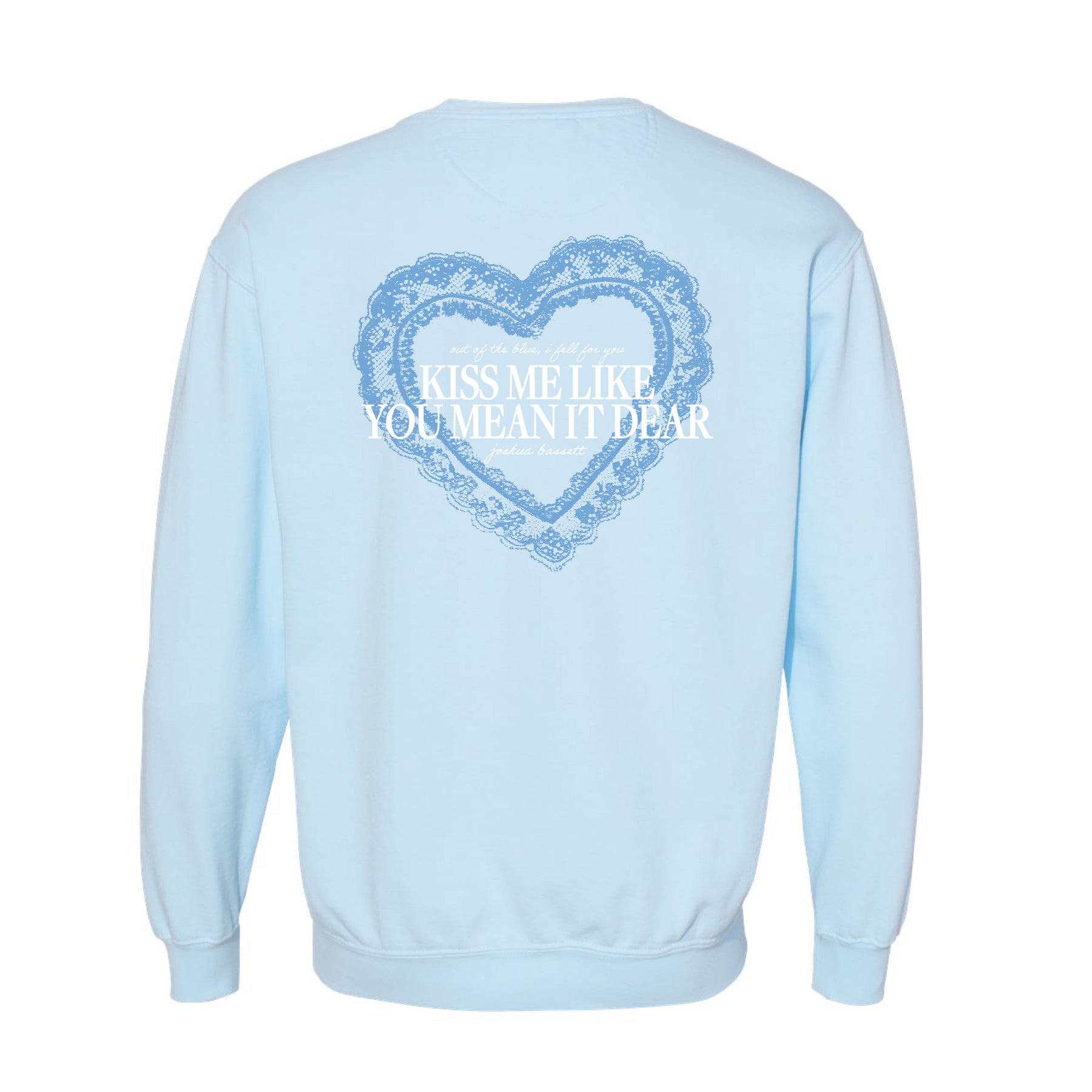The Kiss Me Crewneck is made of 80% cotton and 20% polyester. It is a midweight garment that is garment dyed for a cool look. It features new artwork on the front and back from the new single, "Blue".